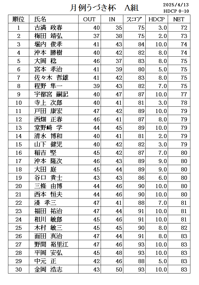 4月 月例うづき杯成績表