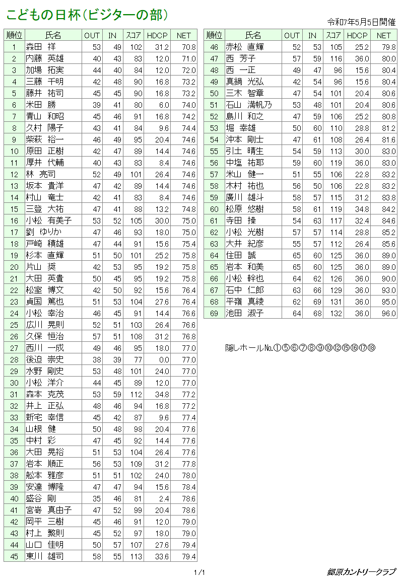 1位:古満 政春さん(スコア 77 ネット 69.8 )