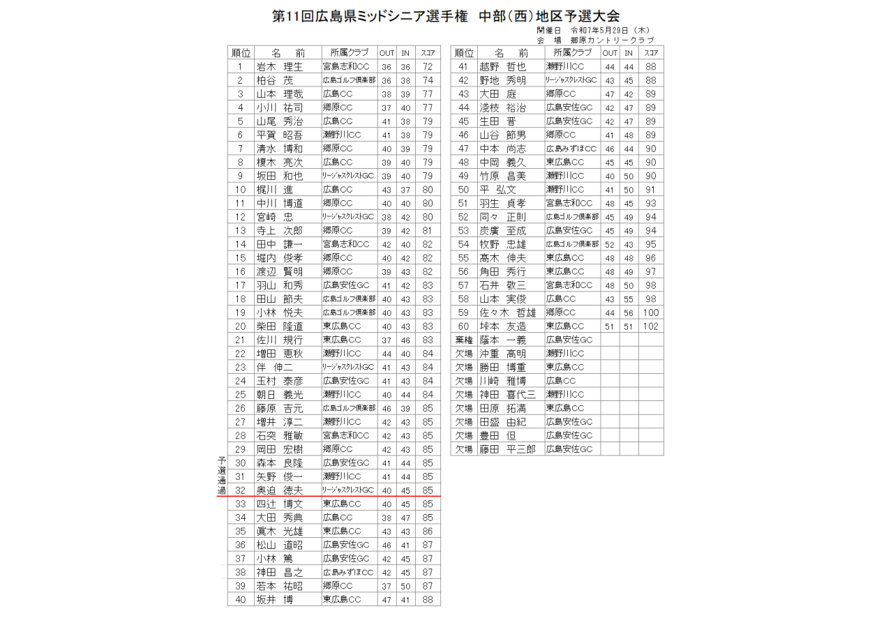 (兼)第11回広島県ミッドシニアゴルフ選手権 地区予選大会の成績です。