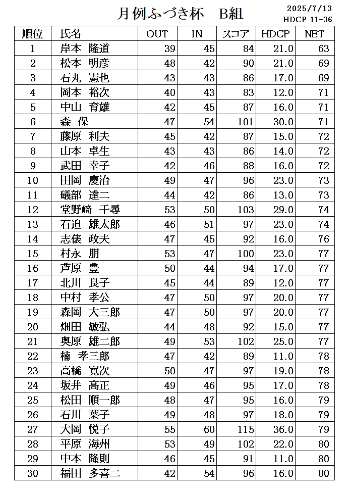 7月 月例ふづき杯成績表