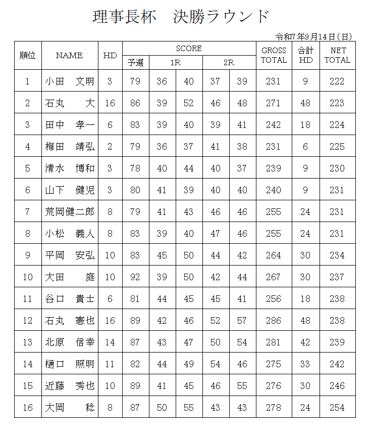 令和7年理事長杯 成績表