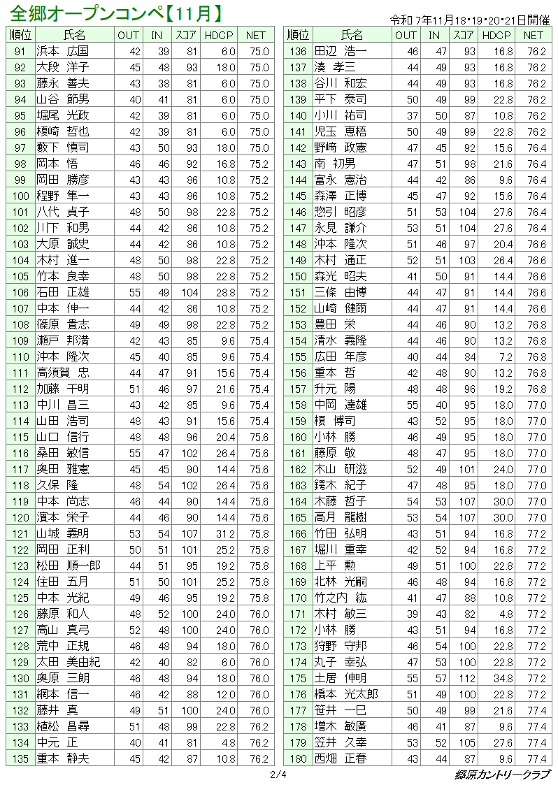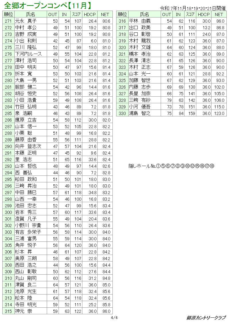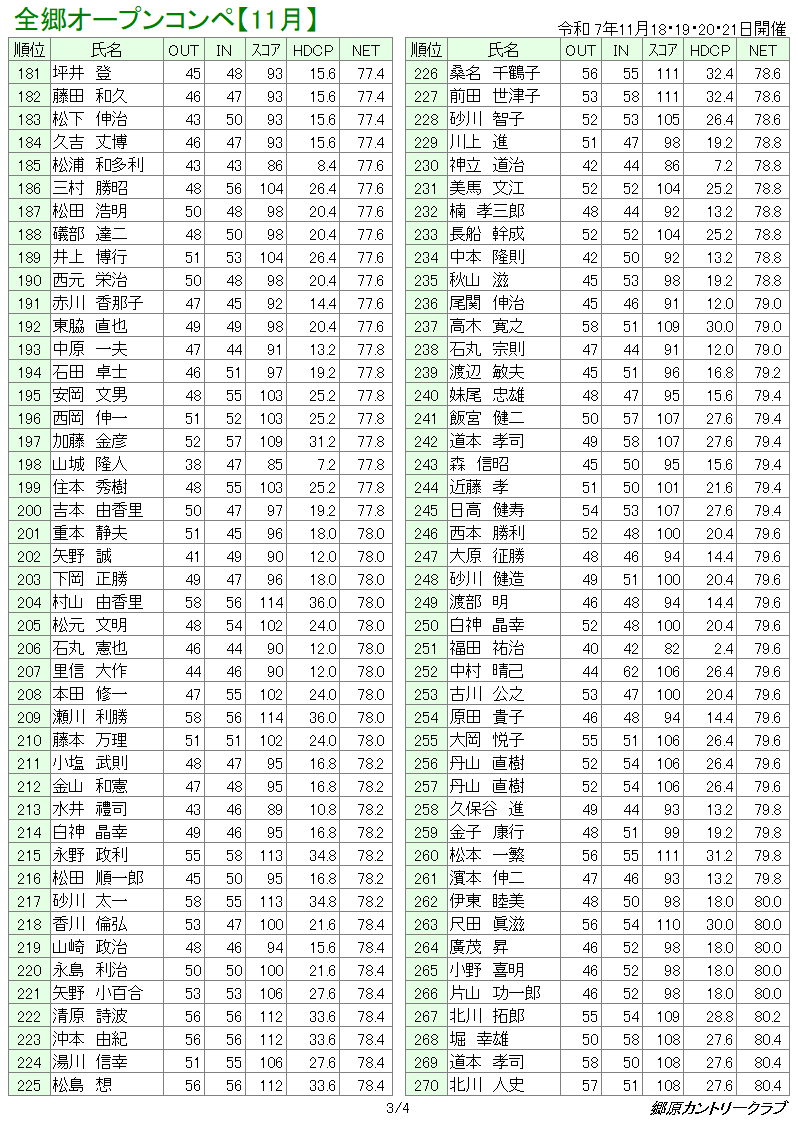 11月全郷オープンコンペ 成績表