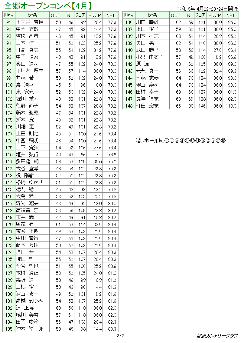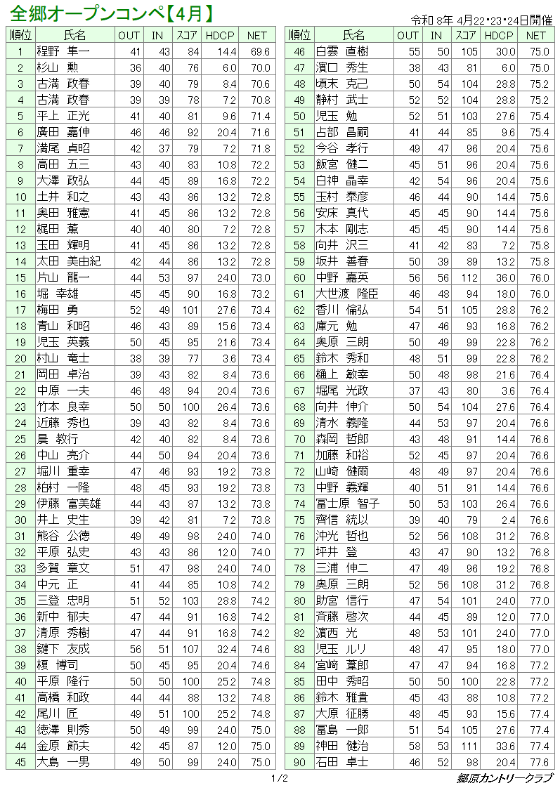 4月全郷オープンコンペ 成績表
