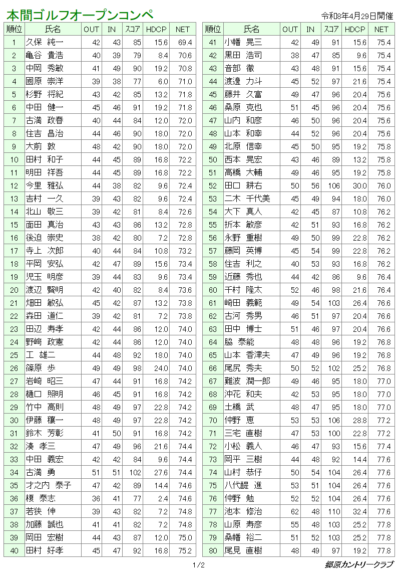 1位:久保 純一さん(スコア 85 ネット 69.4 )