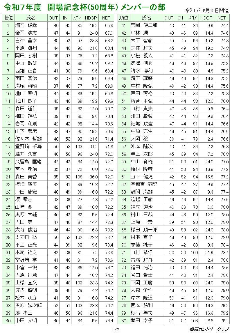 令和6年度 開場記念杯(49周年) 令和6年9月23日に開催いたしました 49周年開場記念杯の結果発表です。 ご参加くださいました皆様、ありがとうございました上位3名様は、 1位:岡本弘枝さん(スコア84ネット64.8) 2位:大森栄作…