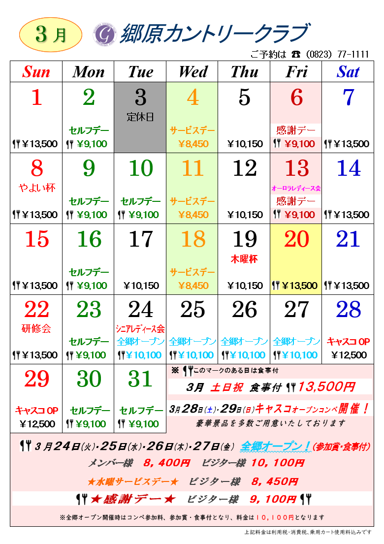 メールでの予約受付は行っておりません。予約状況をご確認の上、必ず、『お電話』もしくは『楽天GORA』『GDO』『じゃらんゴルフ』『VALUE GOLF』にてお願い申し上げます。